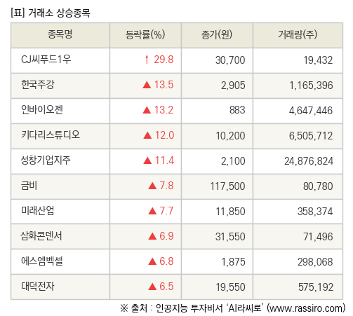 [fnRASSI]장마감, 거래소 상승 종목(CJ씨푸드1우 29.8% ↑) 언론사 : 파이낸셜뉴스 │ 보도일시 : 2023. 01. 03 |