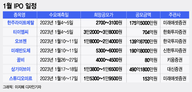 '2023년 IPO' 어떨까…1월 상장 '선발대' 7곳 투자포인트 언론사 : 머니투데이 │ 보도일시 : 2023. 01. 08 |