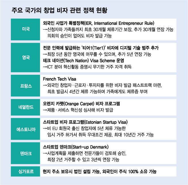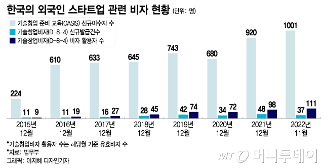 [[MT리포트]머나먼 코리아 창업 드림(上)] ━ 해외인재 유치한다더니...1년만에 짐싸는 외국인 창업가들, 왜? ━ #스마트폰 리소스를 활용해 작동하는 노트북 '미라북'을 개발한 스타트업 미라시스(Miraxess)는 2020년 한국 사업에 도전했다. 한국에 유능한 IT인재가 많고 삼성전자 등 스마트폰 제조사들과도 협업을 할 수 있겠다는 판단이었다. 마침 한국 정부의 외국인 스타트업 국내 안착 프로그램 'K스타트업 그랜드 챌린지'에도 선정되면서 기대감도 높아졌다. 그러나 미라시스는 이듬해 한국 사업을 완전히 철수했다. 국내 사업 파트너들의 폐쇄성을 극복하지 못해서다. 어쩔 수 없이 본국으로 돌아간 미라시스는 삼성전자 본사 대신 프랑스 지사와 협업하며 제품 완성도를 높여갔다. 그 결과 미라시스는 최근 250만유로(35억원)의 시리즈A 투자유치를 완료하고 CES2023에도 참가해 완성된 제품을 선보였다. 정부가 이민청을 설립하는 등 해외 인재를 적극적으로 유치하겠다고 발표했지만 스타트업 생태계에서는 외국인 창업가들의 정착이 여전히 어려운 것으로 나타났다. 우수 기술을 가진 외국인의 국내 창업을 지원하기 위한 기술창업비자(D-8-4) 제도가 올해로 10년차를 맞았지만 발급 건수는 연 40여건에 그치고 있고, 그마저도 절반 가량은 제도적·문화적 장벽을 극복하지 못하고 한국을 떠나고 있다. ◇외국인 K창업 열기 늘지만…'기술창업비자' 10년째 제자리 7일 법무부와 중소벤처기업부에 따르면 2022년 1월부터 11월까지 기술창업비자를 발급받은 외국인 (예비)창업가는 37명에 그치는 것으로 집계됐다. 2013년 기술창업비자 신설 이후 10년이 지났지만 연간 발급건수가 50명을 넘은 적은 없었다. 그마저도 유효한 비자는 111개에 그쳤다. 현재 활동 중인 외국인 스타트업 수가 111개에 불과하다는 의미다. 국내 스타트업 3만4362개의 0.3% 규모다. 외국인들의 한국 창업에 대한 관심 자체가 없는 것은 아니다. 같은 기간 기술창업비자 발급과 창업보육을 받기 위해 '창업이민종합지원시스템(오아시스)' 프로그램을 이수한 외국인은 1001명을 기록했다. 2015년 도입 이후 매년 100여명씩 증가세다. 올해 중소벤처기업부가 운영하는 외국인 스타트업 국내 정착 프로그램 'K스타트업 그랜드 챌린지'도 독일, 싱가포르, 미국, 캐나다, 호주 등 122개국에서 역대 최대 규모인 2653팀이 몰리며 52대1의 경쟁률을 기록했다. ◇폐쇄적 문화·제도에 스케일업 어려워…꺾이는 'K창업 드림' 가까스로 비자를 취득하고 창업까지 성공해도 국내에서 사업을 유지하기는 어렵다는 지적도 나온다. 2015년부터 2022년 11월까지 정부가 발급한 기술창업비자는 총 227건이다. 11월 기준 유효 비자가 111건에 그치는 것을 감안하면 절반 이상이 사업을 지속하지 못하고 한국을 떠난 셈이다. 업계에선 극소수의 귀화 사례를 제외하면 대부분 사업을 중단하고 본국으로 돌아간 것으로 보고 있다. 한국에서 사업을 철수한 스타트업 미라시스의 야니스 안토르 대표는 "한국 사업으로 삼성전자와 파트너십을 강화하는 등 성과를 낼 수 있었다"면서도 "모든 일을 혼자서 해야만 했고 정부나 액셀러레이터들도 외국인 스타트업에는 크게 관심이 없었다"고 지적했다. 외국인들은 국내 창업 관련 제도적 장벽과 폐쇄적 문화가 걸림돌이라고 호소한다. 실제 국내 외국인 스타트업 커뮤니티 '서울스타트업스가 2021년 회원들을 대상으로 진행한 조사에서는 5대 애로사항으로 △언어장벽 △투자유치 기회 부족 △사업파트너·직원 구하기 어려움 △세금 등 제도 문제 △비자 문제 등이 꼽혔다. '서울스타트업스'를 운영하는 마르타 알리나 사우스벤처스 이사는 "다이나믹하고 혁신적인 기업들이 많아 한국에서 창업을 고려하는 외국인들이 점점 늘고 있다"며 "하지만 비자 취득 기준이 까다로워 어려움을 겪는 경우가 많다"고 말했다. 그러면서 "한국 스타트업들이 글로벌 시장에 더 많이 진출하고 성공하기 위해서는 한국 스타트업 생태계도 개방적으로 변해야 한다"고 강조했다. ━ 외국인 창업 장벽높은 한국…선진국은 혁신성만 보고도 'OK' ━ 한국은 스타트업을 하기 좋은 나라다. 창업·보육·투자 환경이 잘 구축돼 있고 다양한 정부지원 사업이 있어 창업 초기에는 별다른 자본금을 쓰지 않아도 최소 3년은 사업을 이끌어갈 수 있다는 말이 나온다. 다만 한국인에 한해서다. 외국인이 한국에서 창업하려면 상당히 많은 허들을 넘어야 한다. 정부가 2013년부터 국내에서 창업하고자 하는 외국인에게 발급하고 있는 기술창업비자(D-8-4)가 대표적이다. 기술창업비자를 받으려면 학사 이상 보유자(국내 대학은 전문학사 이상)로 법인을 설립했거나 설립 절차를 진행 중이어야 한다. 특히 정부가 점수제로 운영하는 '오아시스(OASIS·창업이민종합지원)' 프로그램에서 448점 중 80점 이상을 획득해야 한다. 배점이 낮아 보이지만 각 항목들의 요구 수준이 만만치 않다. 한국을 비롯해 OECD(경제협력개발기구) 국가에서 등록(보유)한 특허나 디자인 등 '지식재산권(IP)'을 중심으로 높은 점수가 배정돼 있기 때문이다. 반드시 1가지를 충족해야 하는 필수항목은 △IP 등록(보유) △IP 출원 △등록