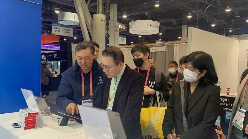 신한금융그룹 조용병 회장(가운데)이 지난 5일 미국 라스베이거스에서 개막한 ‘CES 2023’에서 메타버스 플랫폼 ‘시나몬’ 부스를 둘러보고 있다. 신한은행 제공