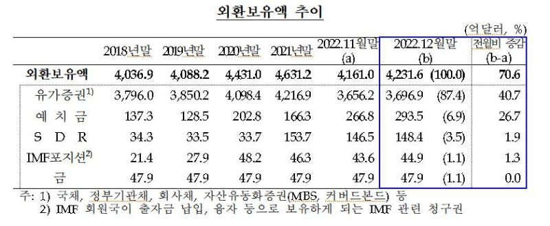 12월 외환보유액 4231.6억달러.. 전월比 70.6억달러↑