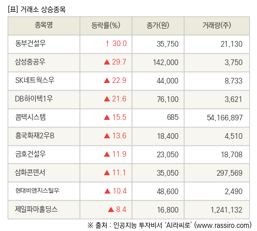 [fnRASSI]장마감, 거래소 상승 종목(동부건설우 30.0% ↑) 언론사 : 파이낸셜뉴스 │ 보도일시 : 2023. 01. 04 |