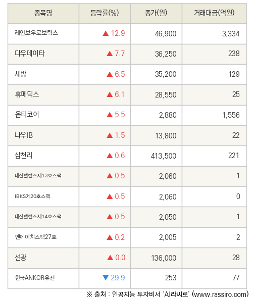 [fnRASSI]레인보우로보틱스, 다우데이타 등 13종목 52주 신고가 경신 언론사 : 파이낸셜뉴스 │ 보도일시 : 2023. 01. 04 |