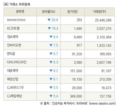 04일 거래소 기준으로 하락한 종목은 한국ANKOR유전(152550) -29.9%, KC코트렐(119650) -18.4%, 경보제약(214390) -18.4% 등이 있다.
