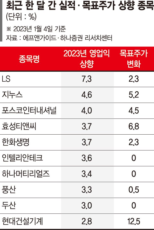 실적 상향 종목에 '매수세' 1월 효과 무색한 증시 반색 약세장이 지속되면서 외국인과 기관 투자자를 중심으로 실적 상승이 전망되는 상장사에 대한 '안전투자' 움직임이 본격화되고 있다. 주요 증권사들도 목표가를 올리며 투자심리를 부추기는 모양새다. 4일 금융정보업체 에프앤가이드와 하나증권 리서치센터에 따르면 최근 한 달 간 목표주가 상승률이 5% 이상을 넘은 상장사는 현대건설기계(12.5%), 효성티앤씨(6.8%), 지누스(5.2%) 등이다. 포스코인터내셔널(4.5%)과 LS·한화생명(2.3%), 포스코홀딩스(1.2%)의 목표주가도 상향 조정됐다. 이들 상장사들의 최근 목표가 상향은 실적 상승을 기반으로 한다. 현대건설기계는 올해 연간 예상 영업이익이 최근 한 달 기준으로 2.8% 상향됐다. 효성티앤씨와 지누스의 영업이익 상향 비율은 각각 3.7%, 4.6%에 이른다. 목표주가 상향 기업 가운데 LS가 영업이익 상향 비율이 7.3%로 가장 높다. 포스코인터내셔널(4.0%), 한화생명(3.7%), 인텔리안테크(3.6%)도 호실적을 기록할 것으로 예상됐다. 이상현 IBK투자증권 연구원은 현대건설기계의 목표주가를 8만2000원으로 올리며 "지난해 상반기 영업실적은 줄었지만 3·4분기부터 증익으로 돌아섰다"고 설명했다. 이어 "사우디아라비아 네옴시티, 인도네시아 등 자원부국 중심으로 높은 수요가 전망된다"고 했다. 외국인과 기관은 최근 유가증권시장에서 이들 기업에 대한 순매수세를 확대하고 있다. 외국인은 지난해 12월 16일 이후 이틀을 제외한 모든 거래일에 순매수를 기록했다. 이 기간 총 130억원어치가 넘는 주식을 사들였다. LS 역시 외국인이 지난달 23일 24억원어치를 사들인데 이어 이날까지 40억원이 넘는 매수 우위를 유지하고 있다. 한화생명은 기관이 최근 10거래일 연속 사들이며 지난달 29일 장중 2805원으로 하반기 신고가를 경신한 바 있다. 증시 전문가들은 부진한 실적과 경기 침체 우려, 제한된 수급 속에서 외국인과 기관이 사들이는 종목에 집중할 것을 추천한다. 지난해 말 산타랠리 부재와 1월 효과가 무색해지는 약세장 속에서 최근 한 달간 외국인과 기관은 기간 평균 대비 훨씬 높은 수준으로 실적 추정치 및 목표주가 변화에 민감하게 베팅했다. 이경수 하나증권 연구원은 "수급 주체들은 배당락 전후의 변동성 장세를 펀더멘털 기반의 매수 혹은 매도 액션의 기회로 활용하고 있다"며 "이익 모멘텀 업종의 수익률 반등세가 관찰되면서 실적 상향 종목의 주도주 장세 분위기로 전환되고 있다"고 진단했다. ![]() |