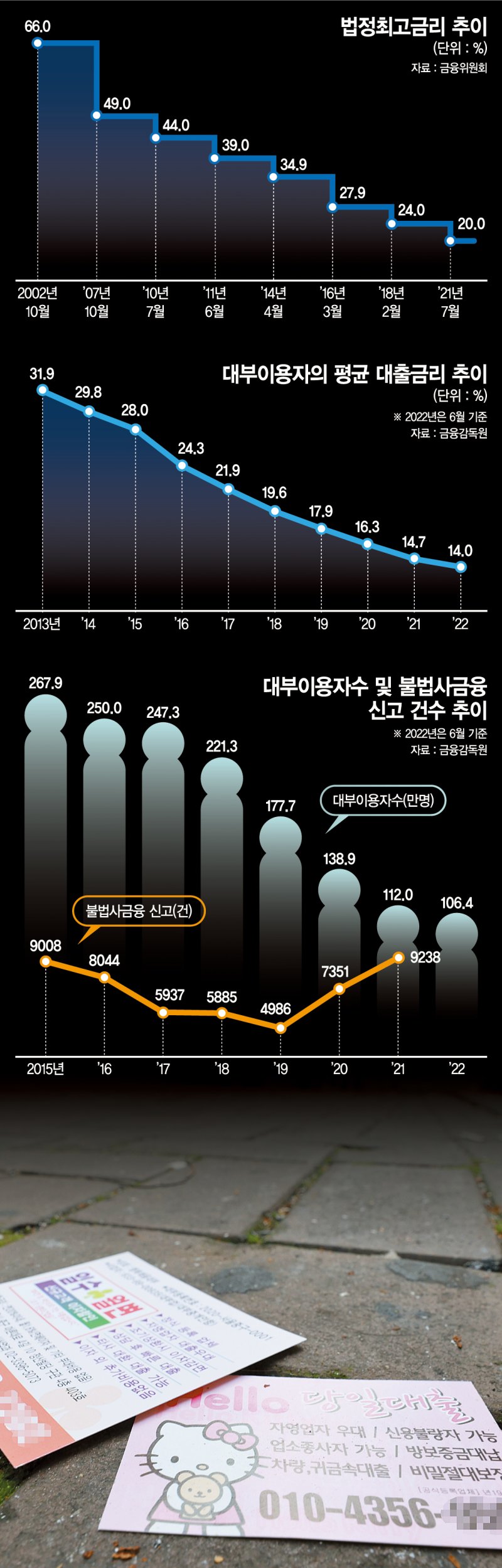 지난해 대부업자들이 벌어들인 수입이 3조5000억원을 넘어 최근 5년 새 4000억원 넘게 늘어났다. 사진은 서울 시내 거리에 떨어져 있는 대출 전단. 연합뉴스 기준금리 인상이 이어지는 가운데 정치권을 중심으로 법정최고금리를 또 다시 낮추자는 주장이 나오고 있다. 취약차주들의 이자부담을 줄이기 위해 법정최고금리를 더 낮춰야 한다는 것이다. 법정최고금리는 대출상품에 대해 법적으로 허용되는 가장 높은 금리다. 대부업법과 이자제한법을 통해 법적으로 등록된 금융업이나 대부업, 개인간 대부 거래 등에 적용되며 현재 20%다.