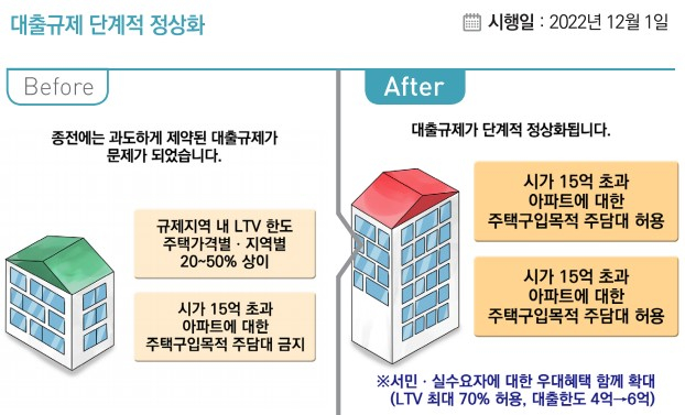 금융당국이 부동산 거래 회복을 위해 올해 대출 규제를 단계적으로 정상화한다. 우선 규제지역에서 LTV(주택담보대출비율)를 50%로 단일화했다. 아울러 오는 6월 청년도약계좌를 출시해 청년층의 목돈 마련을 도울 예정이다. 5일 금융당국에 따르면 지난달 1일부터 규제지역 내 지역별·주택가격별로 차등화된 LTV를 무주택자·1주택자(기존주택 처분조건)를 대상으로 50%로 단일화했다. 기존에는 규제지역 내 LTV 한도가 주택가격 등에 따라 20~50% 차등 적용됐다. 15억원이 넘는 아파트에 대한 주택구입목적 주택담보대출도 허용됐다. 서민·실수요자의 대출한도는 4억원에서 6억원으로 확대됐고, 규제지역에서 주택구입목적 LTV를 최대 70%까지 허용하기로 했다. 금융당국 관계자는 "규제 완화를 통해 과도한 규제로 인해 내 집 마련에 어려움을 겪고 있는 분들을 지원하고, 침체된 부동산 시장의 거래가 점차 회복될 것으로 기대한다"고 설명했다. 금융당국은 올해 다주택자 주담대 금지를 해제하고, LTV 상한 30%를 적용할 예정이다. 오는 6월에는 청년도약계좌가 출시될 예정이다. 개인소득 6000만원 이하, 기준 중위소득 180% 이하인 만 19~34세 청년이 대상이다. 본인이 납입한 금액에 비례해 일정비율의 정부 기여금을 지원하고, 계좌에서 발생한 이자소득 등에는 비과세 혜택을 적용할 계획이다. 월 납입액은 40만~70만원으로 최대 5년 만기로 운영될 예정이다. 소득 수준과 납입 금액에 따라 만기 때 최대 5000만원가량의 목돈을 모을 수 있을 것으로 전망된다. 네이버, 카카오 등 빅테크 기업의 간편결제 수수료율이 오는 2월말부터 반기별로 공시된다. 간편결제 거래 규모 기준 상위 10개사(거래규모의 96.4% 차지)는 개별 업체 홈페이지에 수수료 산정기준과 공시 서식에 따른 수수료율을 공개해야 한다. 이와 함께 수수료를 결제수수료와 기타수수료(일반상거래 관련)로 구분해 관리해야 한다. 금융당국은 수수료 공시를 통해 업체별 경쟁이 촉진되면 장기적으로는 소상공인의 수수료 부담이 경감되는 효과가 발생할 것으로 기대한다. 또 올해부터 금융상품 권유와 계약시 설명의무 등에 대한 확인 방식으로 전자서명 외에 휴대폰 인증, PIN 인증 등도 쓸 수 있다. 외화보험 상품은 적합성과 적정성원칙이 적용돼 금융소비자가 환위험을 명확하게 인지하고, 필요한 경우에만 가입할 수 있다. CTR(고액현금거래) 제공사실을 당사자에게 통보하는 방식도 개선된다. 금융사는 동일인 명의로 1거래일간 현금거래가 1000만원 이상이면 FIU(금융정보원)에 보고하고, 그 사실을 등기우편으로 당사자에게 통보했다. 앞으로는 국민비서 서비스를 이용에 스마트폰으로 CTR제공 사실을 확인할 수 있다. 이외에도 금융 마이데이터 정보제공 범위가 올해 상반기에 기존 492개 정보 항목에서 은행, 보험, 카드, 금융투자, 공공 등 전 분야에 걸쳐 총 720개로 늘어난다. 한국자산관리공사의 자금지원·지급보증 범위는 회생기업에서 기업구조조정촉진법상 부실징후기업과 워크아웃기업까지 확대된다. ![]() |