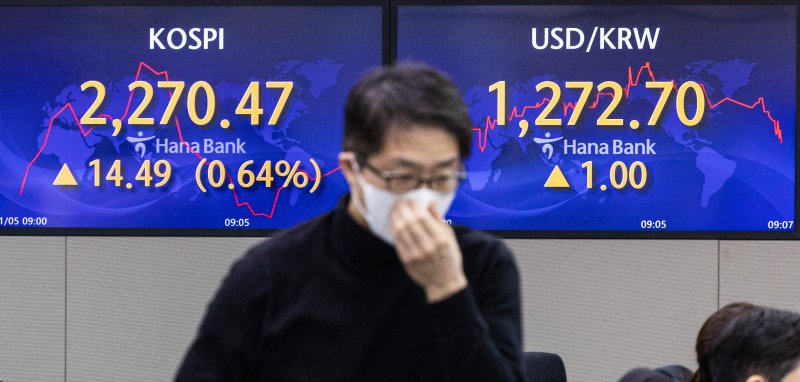 5일 오전 서울 중구 하나은행 본점 딜링룸의 화면에 코스피, 원·달러 환율 거래가가 표시돼 있다. 연합뉴스 제공