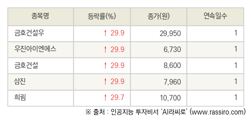 05일 금호건설우(002995), 우진아이엔에스(010400), 금호건설(002990), 삼진(032750), 희림(037440)등이 상한가를 기록했다. 특히 금호건설우는 전 거래일 대비 29.9% 오른 29,950원에 거래를 마감하며 높은 관심을 받았다.