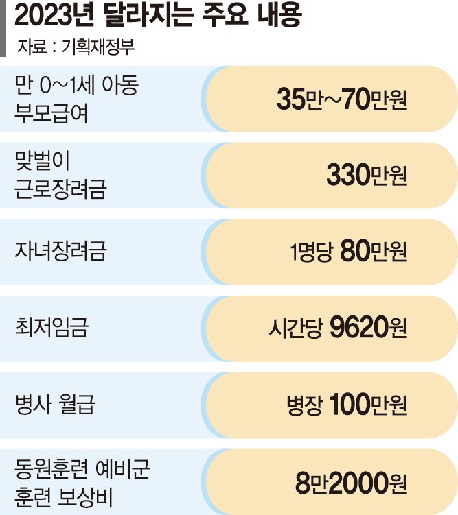 맞벌이 근로장려금 330만원 2주택자 종부세 중과 폐지 병장 월급 100만원으로 올라 6월 28일부터 ‘만 나이’로 통일 올해 1월부터 만 0∼1세 아동 부모에게 부모급여가 월 최대 70만원 지급된다. 맞벌이 기준 근로장려금은 300만원에서 330만원으로, 자녀 1명당 자녀장려금은 70만원에서 80만원으로 인상된다. 종합부동산세가 완화돼 기본공제가 공시가 9억원으로 오르고 1가구 1주택자는 공시가 12억원까지 비과세된다. ■0세 아동 부모급여 월 70만원 5일 기획재정부는 '2023년부터 이렇게 달라집니다' 책자를 발간하고 36개 정부기관 249건의 달라지는 법·제도를 수록했다. 부모급여는 1월 1일부터 만 0세 아동에 월 70만원, 만 1세는 월 35만원이 지급된다. 근로·자녀장려금의 재산요건을 확대하고 최대 지급액을 인상한다. 재산 요건은 2억원 미만에서 2억4000만원 미만으로 확대된다. 근로장려금 지급액은 단독가구 150만원에서 165만원, 홑벌이는 260만원에서 285만원, 맞벌이는 300만원에서 330만원으로 확대된다. 자녀 1명당 자녀장려금은 70만원에서 80만원으로 오른다. 종합부동산세는 1가구 1주택자의 경우 공시가 12억원까지 비과세, 2주택자 종부세 중과도 폐지된다. 3주택 이상도 과세표준 12억원 이하는 중과되지 않는다. 생애최초 주택구입자는 200만원 한도에서 취득세를 면제받게 된다. ■최저임금 시간당 9620원 최저임금은 시간당 9620원으로 인상돼 주40시간 근로 기준으로 월 201만580원을 받게 된다. 4인가구 기준 최대 생계급여액은 올해 154만원에서 내년 162만원으로 인상된다. 연금계좌 세액공제 한도는 200만원 상향된다. 연금저축 납입액은 400만원에서 600만원, 개인형 퇴직연금(IRP) 등 퇴직연금 포함 시에는 700만원에서 900만원까지 세액공제된다. 연금소득이 1200만원을 초과하는 경우 다른 소득과 합산해 종합과세했다. 하지만 올해부터 분리과세(15%)를 선택할 수 있다. 세액공제 한도 상향은 2023년 1월 1일 이후 납입분부터, 1200만원 초과 연금소득의 분리과세 선택은 2023년 1월 1일 이후 연금수령분부터 적용된다. 생계급여와 의료급여 수급자의 재산을 산정할 때 적용하던 지역 구분 방식은 3급지에서 4급지로 개편한다. 기본재산공제액도 확대해 더 많은 수급자에게 혜택을 제공한다. 재산기준 완화로 생계급여 3만5000가구, 의료급여 1만3000가구가 수혜를 받게 될 것이라고 복지부는 전망했다. 자립준비청년 자립수당은 35만원에서 올해부터 월 40만원으로 오른다. 1인가구 기준 58만3400원이던 생계지원금 단가는 62만3300원으로 올라간다. 장애수당의 단가도 올해부터 50% 인상된다. ■낡은 주택도 층간소음 기준 강화 미세먼지 방지를 위해 노후경유차 조기폐차 지원은 4등급 경유차까지 확대한다. 굴착기·지게차 건설기계도 지원한다. 4등급 경유차량 조기폐차가 계획대로 진행되면 자동차 배출 초미세먼지의 약 8.4%, 온실가스의 약 4.8%가 줄어든다는 게 기재부의 계산이다. 분쟁·민원이 심각한 공동주택 층간소음 기준이 강화돼 기존 노후주택도 강화된 기준을 적용받게 된다. 공동주택 층간소음 기준은 주간 39㏈, 야간 34㏈로 4㏈씩 강화된다. 2005년 6월 30일 이전에 사업승인된 노후공동주택의 경우 2024년 12월 31일까지는 소음 기준에 5㏈을 더한 값을, 2025년 1월 1일부터는 2㏈을 더한 값을 적용한다. 자영업자 고용보험료 지원 대상도 확대된다. 자영업자 고용보험료 납부부담 경감을 위해 근로자를 고용하고 있지 않은 소상공인으로 한정해 보험료의 20~50%를 5년간 지원해 왔지만 제도 개선을 통해 자영업자 고용보험에 가입한 소상공인 고용보험료를 지원받을 수 있게 된다. ■6월 28일부터 만 나이로 통일 새해 병사 월급은 병장이 100만원으로 올라 전역 때 받는 내일준비적금 정부 지원금 30만원을 적용하면 병장은 월 최대 130만원을 받게 된다. 동원훈련예비군 훈련보상비가 2022년 6만2000원에서 32% 증가한 8만2000원으로 인상된다. 6월 28일부터는 한국식 나이 계산법을 폐지하고 만 나이로 민사·행정 기준을 통일한다. 사회서비스형 노인일자리와 민간 취업과 연계되는 민간형 노인일자리도 확대된다. 사회서비스형 1만5000명, 민간형 2만3000개 등 전년 대비 3만8000명이 늘어난다. 재난적의료비 지원 제도의 문턱도 낮아진다. 상반기부터 지원 대상에 미용·성형 등을 제외한 모든 질환이 포함된다. 한도는 연 3000만원에서 5000만원으로 올라간다. 의료비 기준은 연간 소득의 10%를 초과할 경우로 재산 기준은 과세표준액 7억원 이하로 각각 완화된다. ![]() |