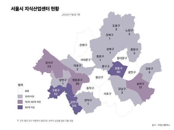 서울시 지식산업센터 분포 현황. /부동산플래닛 제공 [파이낸셜뉴스] 그동안 수익형 부동산으로 각광받던 지식산업센터(옛 아파트형공장) 거래가 급속히 줄어든 것으로 나타났다. 금리인상이 계속되면서 대출금리 부담에 투자 수요가 줄었기 때문이다. 서울 아파트값마저 하락하면서 상업용 부동산이 더이상 매력적인 투자처가 아니기 때문이라는 분석도 있다.