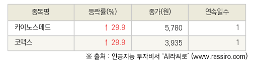 06일 카이노스메드(284620), 코맥스(036690)등이 상한가를 기록했다. 특히 카이노스메드는 전 거래일 대비 29.9% 오른 5,780원에 거래를 마감하며 높은 관심을 받았다.