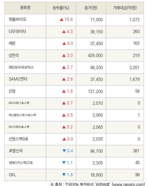 06일 피플바이오(304840), 다우데이타(032190), 세방(004360), 삼천리(004690), 레인보우로보틱스(277810)등이 장중 52주 신고가를 경신했다. 특히 피플바이오는 전 거래일 대비 15.6% 오른 17,000원에 거래를 마감하여 높은 관심을 받았다. 이외에 GKL는 19,550원까지 올라 신고가를 경신했으나, 전일보다 오히려 하락한 18,900원에 거래를 마감했다.