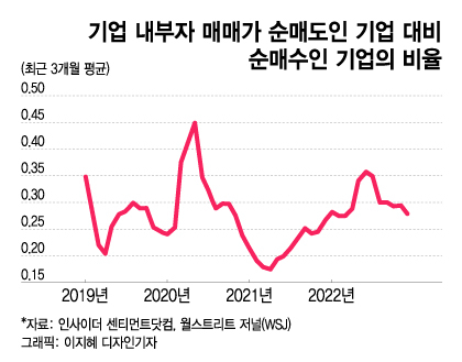 미국 증시가 지난달 기술주 위주로 큰 폭 하락했다. 하지만 기업 사정을 잘 아는 내부자들은 주식의 밸류에이션이 여전히 싸다고 느끼지 않는 것으로 보인다. 인사이더 센티먼트닷컴이 산출한 기업 내부자 심리가 6개월 연속으로 하락했기 때문이다. 이는 2년만에 최장기 하락세다. 기업 내부자 심리는 기업 경영진과 이사들의 자사주 매매가 순매도인 기업 대비 순매수인 기업의 비율을 최근 3개월간 평균해 계산한다. 기업 내부자들의 매도 금액과 매수 금액을 단순 비교하지 않고 내부자가 자사주를 순매도한 기업의 수와 순매수한 기업의 수를 비교하는 이유는 특정 한 사람의 매매가 전체적인 기업 내부자 심리를 좌우할 수 있어서다. 기업 내부자들은 일반 투자자들보다 자사 사업 전망을 더 정확히 알 수 있다. 월스트리트 저널(WSJ)은 이들이 주가 급락에도 자사주를 적극적으로 매수하지 않는다는 것은 증시가 아직 바닥을 찾지 못했다는 신호일 수 있다고 지적했다. 기업 내부자들의 매매가 순매도인 기업 대비 순매수인 기업 비율의 최근 3개월간 평균 추이를 보면 코로나 팬데믹 초기인 2020년 3~5월 사이에 큰 폭으로 뛰어오른 것을 알 수 있다. 이 때는 증시가 폭락하다 급반등하던 초기 국면이다. 이 비율은 이후 2021년 4월까지 쭉 떨어졌다가 다시 올라가기 시작했다. 그러다 2011년 11월 나스닥지수가 사상최고치를 기록하기 전달 소폭 하락했지만 다시 슬금슬금 올라 지난해 서머(여름) 랠리가 시작되기 직전인 6월까지 상승했다. 하지만 이후엔 쭉 내림세다. 기업 내부자 거래를 연구하는 미시간대학의 금융학 교수인 네자트 세이훈은 WSJ에 "분명한 사실은 현재 주가가 많이 떨어졌는데도 기업 내부자들의 매수세가 부족하다는 것"이라며 "이는 일종의 경고 신호"라고 말했다. 기업 내부자 매매를 분석하는 워싱턴 서비스에 따르면 지난해 기업 내부자 중에 자사주를 가장 많이 매도한 인물은 테슬라 CEO(최고경영자)인 일론 머스크로 230억달러를 팔았다. 월마트 창업자인 샘 월튼의 상속인인 롭 월튼과 콘스텔레이션 브랜즈의 전 CEO인 롭 샌즈, 에어비앤비의 공동 창업자인 조 게비아, 알파벳의 공동창업자인 래리 페이지와 세르게이 브린도 지난해 자사주를 대거 팔아 치웠다. 워싱턴 서비스에 따르면 이들의 총 매도 금액은 8억9500만달러에 달한다.. 반면 소프트웨어 개발회사인 아사나의 창업자이자 CEO인 더스틴 모스코비츠는 지난해 기업 내부자 중에서는 가장 많은 9억2100만달러의 자사주를 매입했다. 그는 지난해 9월 실적 콘퍼런스 콜에서 "시장의 기회가 엄청나기 때문에" 아사나 주식에 투자하고 있다고 밝혔다. 기업 내부자들의 매도는 내부 정보 이용의 가능성 때문에 규제를 받아 대개 미리 예정돼 이뤄진다. 또 기업 내부자들은 성과급을 자사주로 받는 경우가 많아 통상 매도가 매수보다 많다. 그럼에도 최근의 기업 내부자 매수세는 상대적으로 부진한 것이 사실이라고 WSJ는 지적했다. 허틀, 캘러건 & Co.의 최고투자책임자(CIO)인 마크 해밀턴은 기업 내부자들이 최근 주식 매수에 나서지 않는 것은 다른 일반 투자자들이 매수를 주저하는 이유와 같다고 지적했다. 연준(연방준비제도)이 금리를 올리고 있는 상황에서 증시가 추가 하락하지 않을 것이라고 확신할 수 없기 때문이라는 설명이다. 그는 "시장 심리는 전반적으로 부정적이고 기업 내부자들도 마찬가지"라며 "주식 투자로 손실을 입은 사람들이 악재가 나오고 있고 주가는 하락한 상황에서 주식 투자를 주저하는 것은 자연스러운 심리"라고 지적했다. ━ 12월 취업자수 증가폭 둔화 전망 ━ 한편, 6일 오전 8시30분(한국시간 오후 10시30분)엔 지난해 12월 취업자수 증가폭과 실업률이 발표된다. 5일 미국 증시는 노동부의 지난달 취업자수 동향에 앞서 나온 다른 고용지표들이 예상보다 강해 연준의 긴축 스탠스가 강화될 수 있다는 우려로 하락했다. ADP에 따르면 지난해 12월 민간 부문 취업자수는 23만5000명 늘어 예상치 15만3000명을 크게 웃돌았다. 지난주 신규 실업급여 청구건수는 지난해 9월 이후 최저치로 떨어져 실업자수가 줄었음이 확인됐다. 고용시장이 강세를 지속하면 인건비 상승 압력으로 인해 인플레이션을 연준의 목표치인 2% 수준까지 끌어내리기가 어려워진다. 고용시장이 호황을 계속하는 한 연준이 긴축을 중단하기가 부담스러울 수밖에 없는 이유다. WSJ가 이코노미스트들을 대상으로 조사한 결과 지난해 12월 취업자수는 20만명 늘어났을 것으로 전망된다. 이는 지난해 11월의 취업자수 증가폭 26만3000명에 비해 둔화된 것은 물론 2년만에 최저 수준이다. 하지만 이코노미스트들은 이미 지난해 여름부터 고용 증가폭이 급격히 둔화될 것으로 예상했으나 번번히 예측은 틀려 왔다. 아울러 제롬 파월 연준 의장은 지난해 말 연설을 통해 월간 취업자수 증가폭은 10만명 수준이면 적절하다는 입장을 밝혔다. 지난해 12월 시간당 임금은 전달에 비해 0.4% 올랐을 것으로 예상된다. 지난해 시간당 임금은 노동력 수급이 빠듯한 상태를 유지하면서 5.1% 급등했다. 연준은 시간당 임금 인상률을 3% 이내로 떨어뜨리기를 원하고 있다. 지난해 12월 