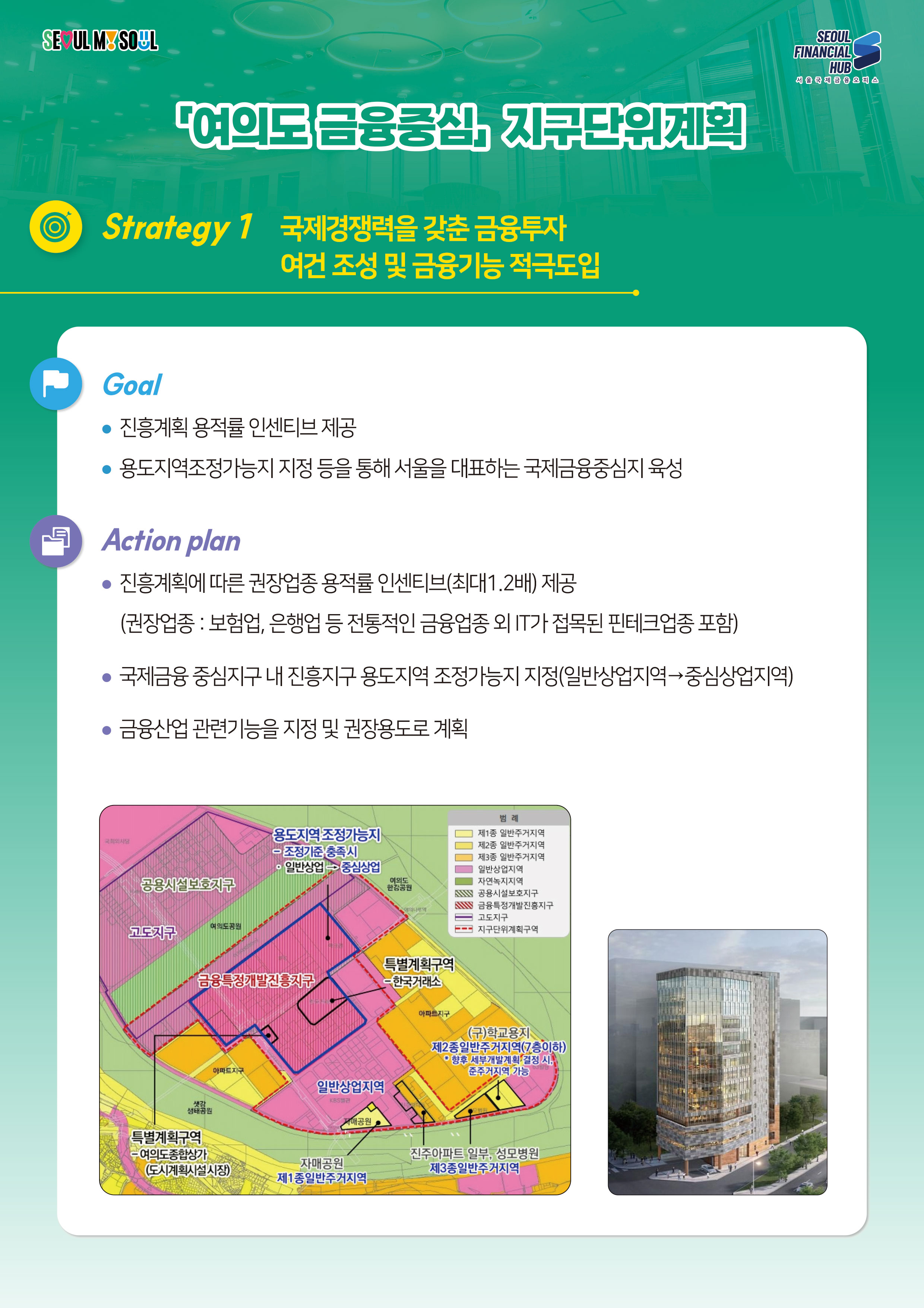 서울국제금융오피스에서 전해드리는 서울 금융 소식, 'Seoul Finance Snapshot #6'이 발간되었습니다. ‘Seoul Finance Snapshot’에서는 서울시의 금융 관련 정보가 제공되니 많은 관심 부탁드립니다. 이번 호에서는 서울의 금융중심지인 여의도가 국제 디지털금융중심지로 도약하기 위해 서울시가 수립한 「여의도 금융중심」 지구단위계획을 소개합니다. ○ 전략별 목표 1. 국제경쟁력을 갖춘 금융투자 여건 조성 및 금융기능 적극도입: 진흥계획 용적률 인센티브 제공, 용도지역조정가능지 지정을 통해 국제금융중심지 육성 2. 다양한 도시기능의 복합 및 글로벌 인재 정주여건 조성: 중소규모 업무, 금융지원시설, 가로활성화용도 도입 등 금융산업 생태계를 지원하는 공간 조성 3. 국제 수준의 도시환경을 위한 보행 및 공간 네트워크 조성: 도심활동에 필요한 다양한 생활지원기능 육성 4. 매력적인 도시경관을 위한 창조적 건축환경 조성: 다양한 유형의 도심주거, 외국인 생활지원공간 등 국세수준에 부합하는 쾌적한 생활 문화환경 조성 자세한 정보는 인포그래픽을 통해 확인하실 수 있습니다.
