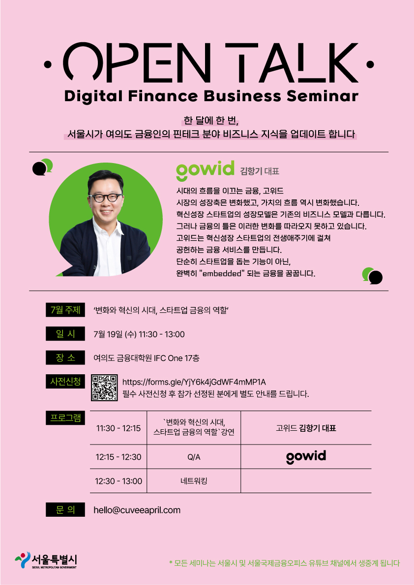 Hello, we would like to invite you to a digital finance seminar organized by the Seoul Metropolitan Government and the Seoul Financial Hub!